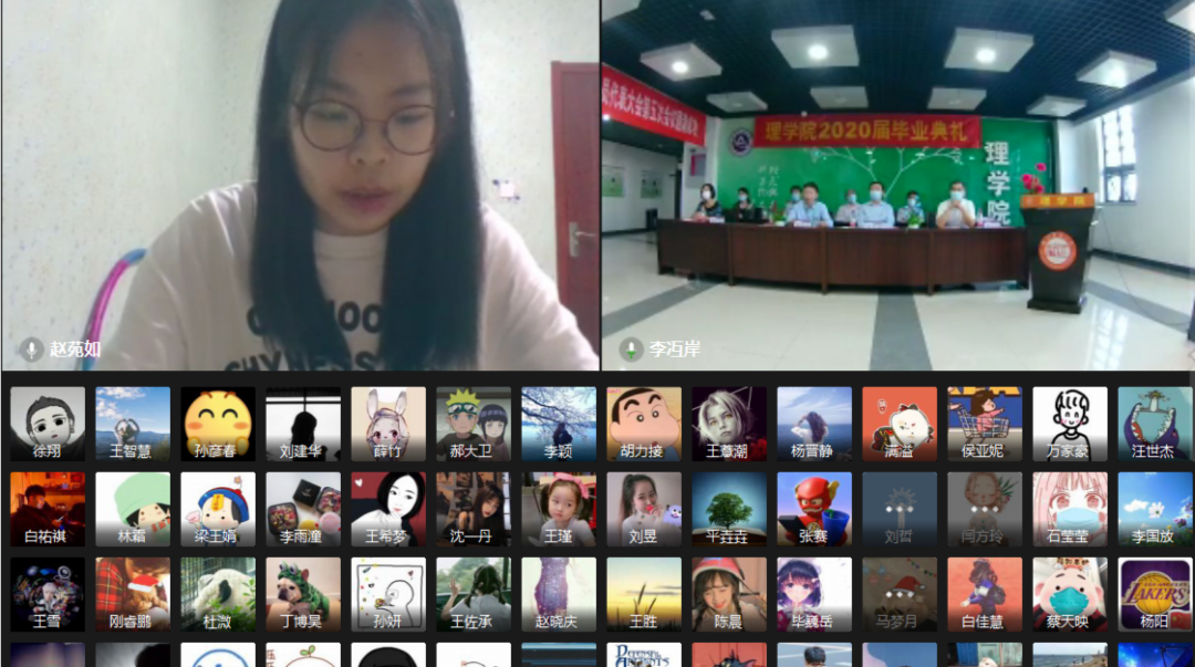 毕业典礼在国歌声中隆重开幕,现场全体老师肃立跟唱,在线的同学们在全国各地起立跟唱国歌。