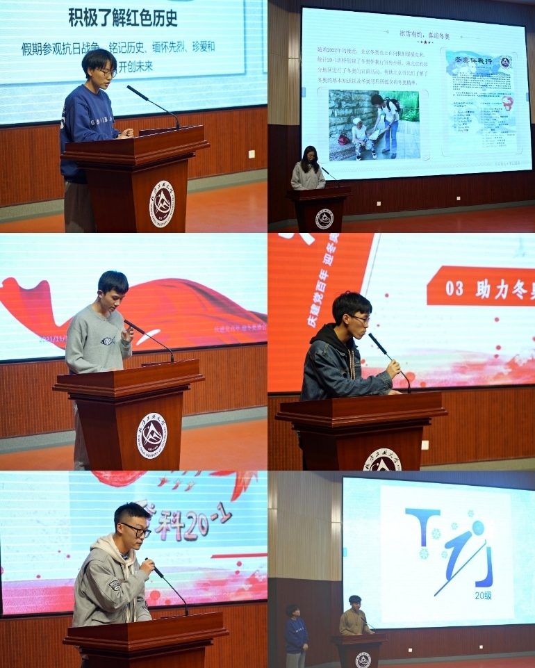 第二个环节是冬奥知识竞赛和主题宣讲。为让同学们更深入地了解冬奥会的相关知识,各班派代表队参加了冬奥知识竞赛和“心有灵犀猜冬奥”默契大考验活动。竞赛中,各班代表踊跃抢答,竞争激烈,在竞猜环节用肢体动作描述冬奥项目,很好地普及了冬奥知识。统19-2班齐添添同学从冬奥发展历程、中国健儿冬奥之路、中国申奥历程等方面进行了冬奥主题宣讲。