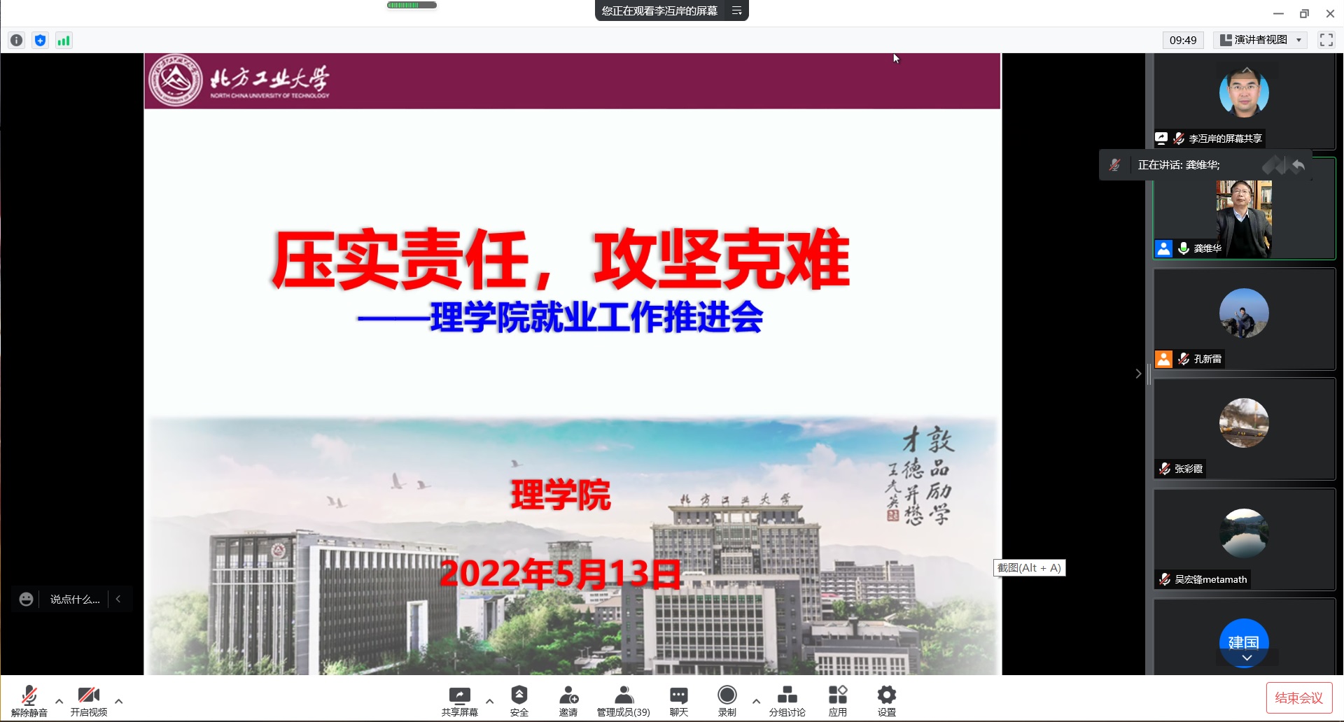 5月13日晚,买球官方网站召开2022届毕业生就业工作线上推进会,学院班子成员、各系主任、责任教授、学院全体研究生导师、数学系和统计系全体教师、办公室全体成员参加会议。会议由党委副书记李冱岸主持。