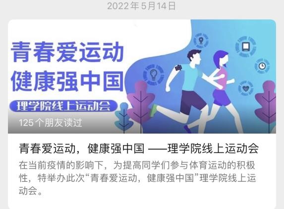 在第一阶段的活动中,买球官方网站号召参赛同学于5月14日-5月18日内进行“平板支撑”力量训练,并拍摄运动视频与App截图打卡,共收到来自361名同学的875次精美打卡视频。并于5月19日,派出在第一阶段打卡过程中积极备赛、坚持锻炼的35名运动达人参加学校举办的腾讯会议线上挑战赛。