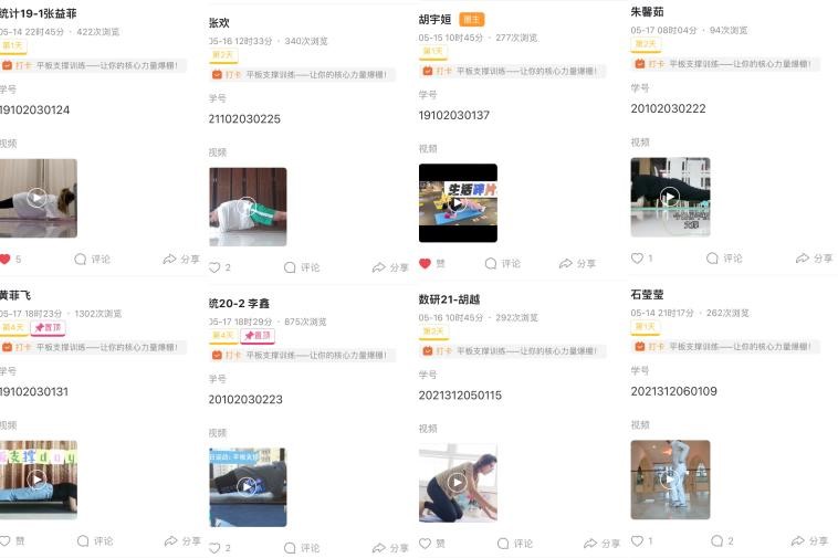 统19-1的张益菲同学说到,在疫情的影响下,我们以居家学习的方式开启了本学期的学习生活。因此,我十分感谢本次线上运动会给予了我与分隔异地的同学们能够一起大汗淋漓的机会。快乐的生活,需要用健康的身体去享受,幸福的感觉,需要用健康的心态去体会,美好的一切源于健康。无论是否在校,我们都需要重视个人的健康问题。最后,我希望能够呼吁更多的同学来加入到热爱运动的集体中,让我们一起互相监督,互相鼓励,在学习之余,保证自己有一个健康的身体,劳逸结合,让学习更佳高效。信19-1班的张喜同学说到,天行健,君子以自强不息;地势坤,君子以厚德载物。身体素质是生活的本钱,通过这次线上打卡的机会,更加促进我体育锻炼的积极性,让我们的身体更加刚强劲健。在疫情肆虑的现如今,有一身健壮的身体素质,是必不可少的。希望大家多多参与到体育锻炼中,少年强,则中国强。统19-1的胡宇姮同学说到,加强体育锻炼,是疫情生活中的重要之重。我们居家锻炼身体,增强体质,提高防疫抵抗力,有好的抵抗力才能抵御病毒!统21-2的侯思嘉同学认为在这活力四射的五月,学校联合各个学院组织的这次运动会帮助我们更好的养成规律运动的好习惯,促进了同学们积极参与体育锻炼。原本我们本应齐聚运动场努力拼搏,加油呐喊,乐享运动魅力。不料被新冠疫情阻挡了脚步。所以本次的线上运动会就显得尤为重要,可以促进我们提高身体素质,共同抵抗疫情。在这次线上运动会中,平板支撑运动十分精彩,这项活动不仅锻炼了我们坚持不懈的决心而且提高了我们的毅力。信21-1的黄馨瑶同学认为疫情期间时间比较充裕,参加这次的平板支撑活动也让我重拾了对运动的热情,并且在比赛中也能发掘自己在挑战不同运动时潜力,是一次非常难得的挑战自己的机会。且适当运动也是一个舒缓压力的方式,在疫情的影响下适当的锻炼能够增强自己的免疫力也能让身心放松,打卡活动是一个很好的激励自己的机会。同时这次活动也使我对运动又有了新的认知和收获,相信我今后也会坚持下去长期锻炼,精益求精的提高自己的运动技能。
