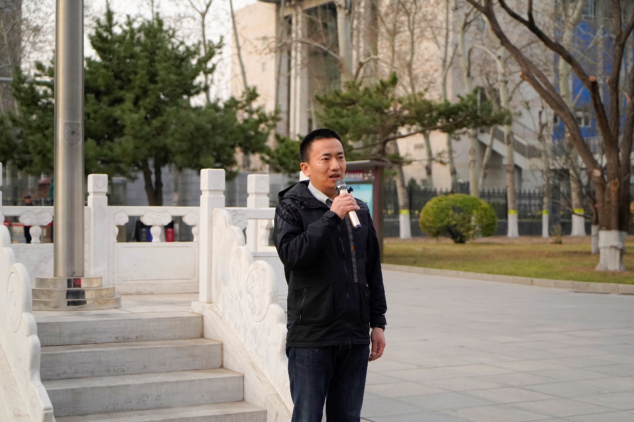 国旗护卫队迈着铿锵有力的步伐,护送着五星红旗正步走向旗杆。伴随着激昂嘹亮的《义勇军进行曲》,五星红旗在全体师生的注目下冉冉升起,迎着朝阳,熠熠生辉。