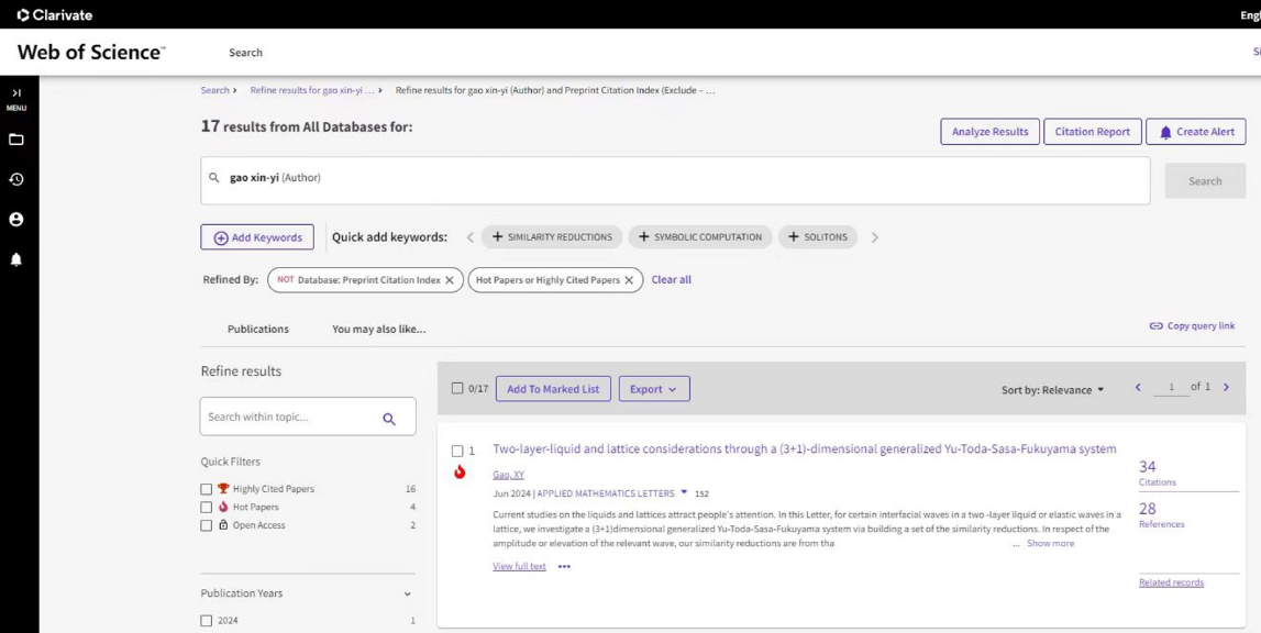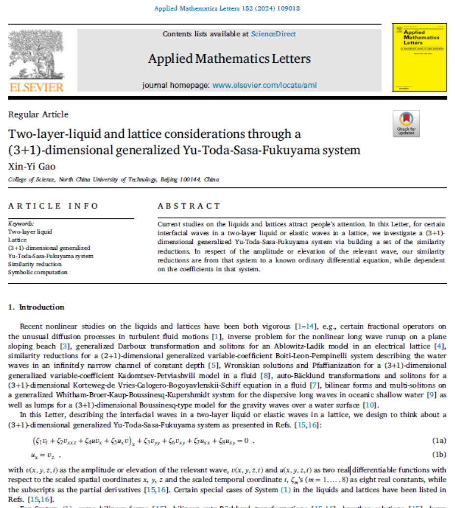 近日,买球官网买球官方网站教师高心怡在Applied Mathematics Letters(应用数学快报)发表的标题为Two-layer-liquid and lattice considerations through a (3+1)-dimensional generalized Yu-Toda-Sasa-Fukuyama system[通过(3+1)维广义Yu-Toda-Sasa-Fukuyama系统考察双层液体和晶格]的文章入选“ESI热点论文”。