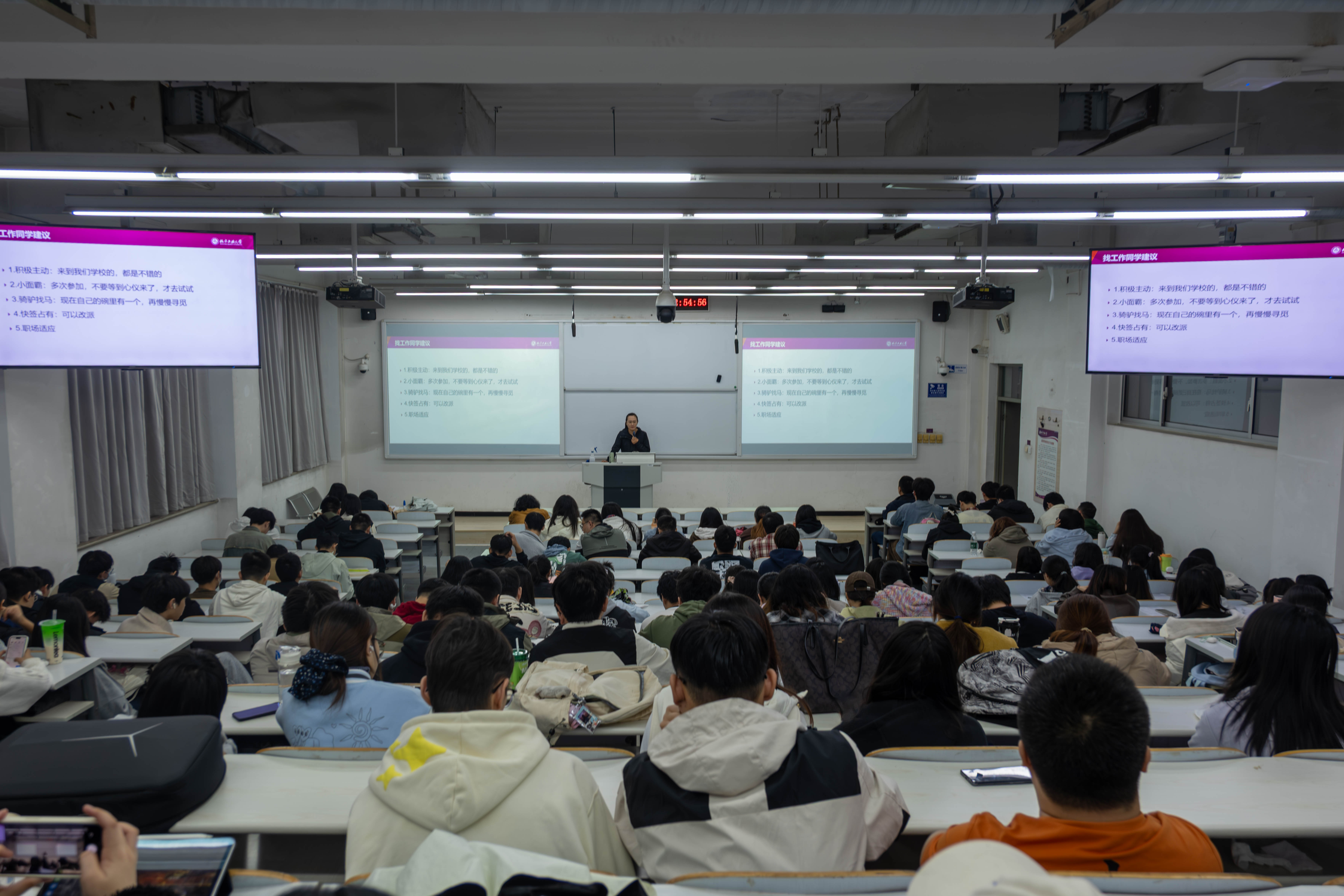 学院党委副书记贺映勇为毕业生详细讲解就业形势与政策,并提三点建议:一是筑牢安全防线。求职警惕不规范招聘,实习主动了解法规,维护合法权益。二是紧抓秋招窗口。提前研究企业要求,打磨简历、强专业能力,力争锁定理想岗位。三是做好多元预案。预设深造、求职变数,同步规划备选方案,以“多手准备”应对不确定性。