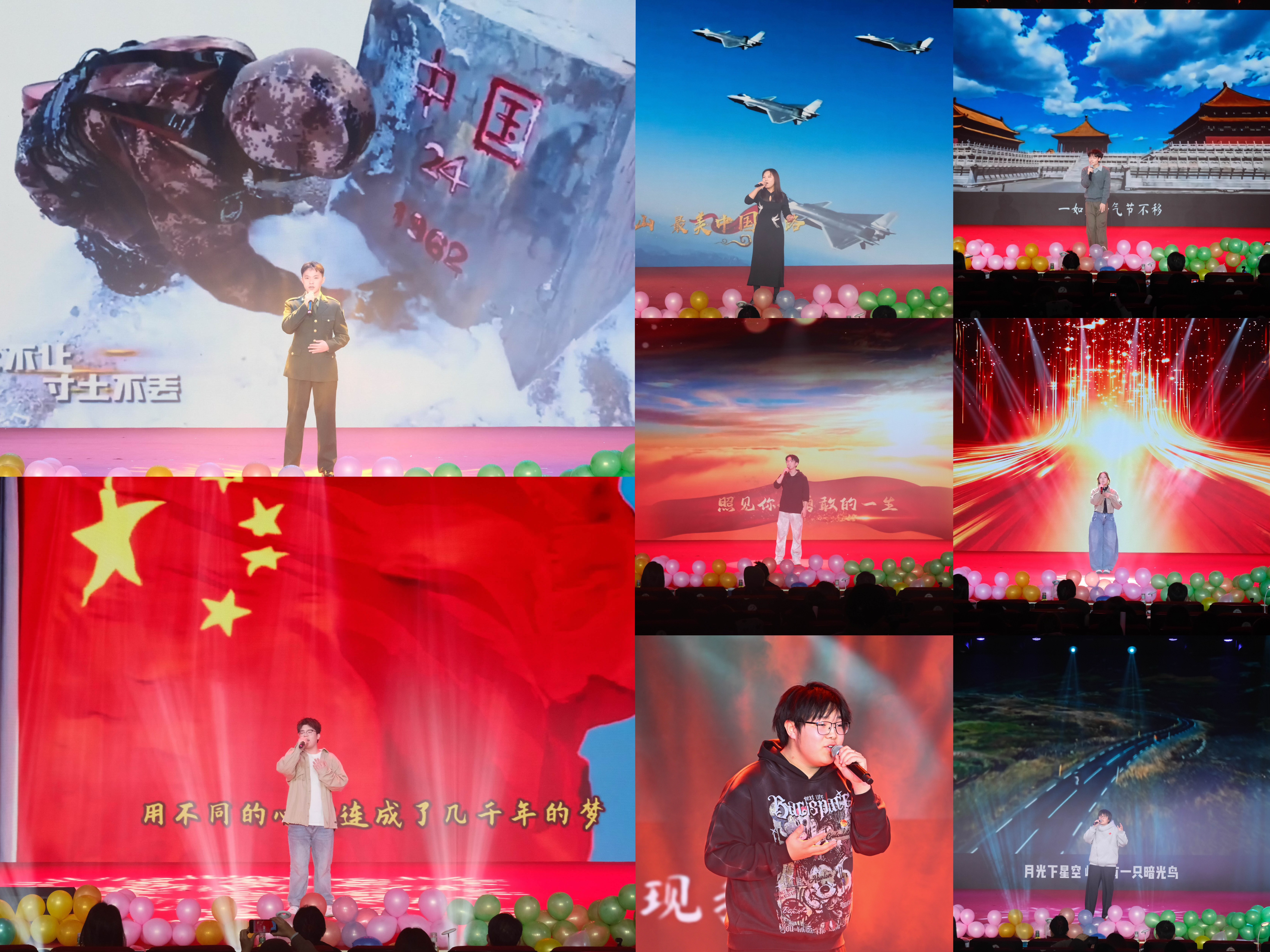 第一环节:八位选手依次登台演唱,用独特的嗓音和精湛的演绎展现各自的音乐实力。《请放心吧,祖国》的深情告白、《不忘初心》的坚定执着、《铭记》的深沉湎怀、《是龙》的豪迈激昂、《千山万水》的追梦情怀、《有我》的青春担当、《看得最远的地方》的美好憧憬以及《明日坐标》的奋进力量,每一段旋律都扣人心弦,每一句歌声都传递心声,充分展现了买球官网学子积极向上的精神风貌。