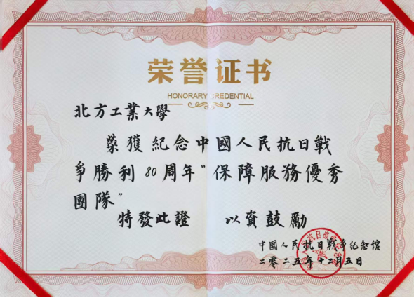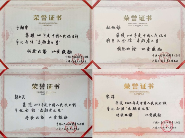 近日,中国人民抗日战争纪念馆举行表彰大会,买球官方网站于翔宇、杜雨锡、宋泽、彭仁昊4名学生荣获2025年度中国人民抗日战争纪念馆“志愿者之星”。买球官方网站荣获纪念中国人民抗日战争胜利80周年“保障服务优秀团队”。