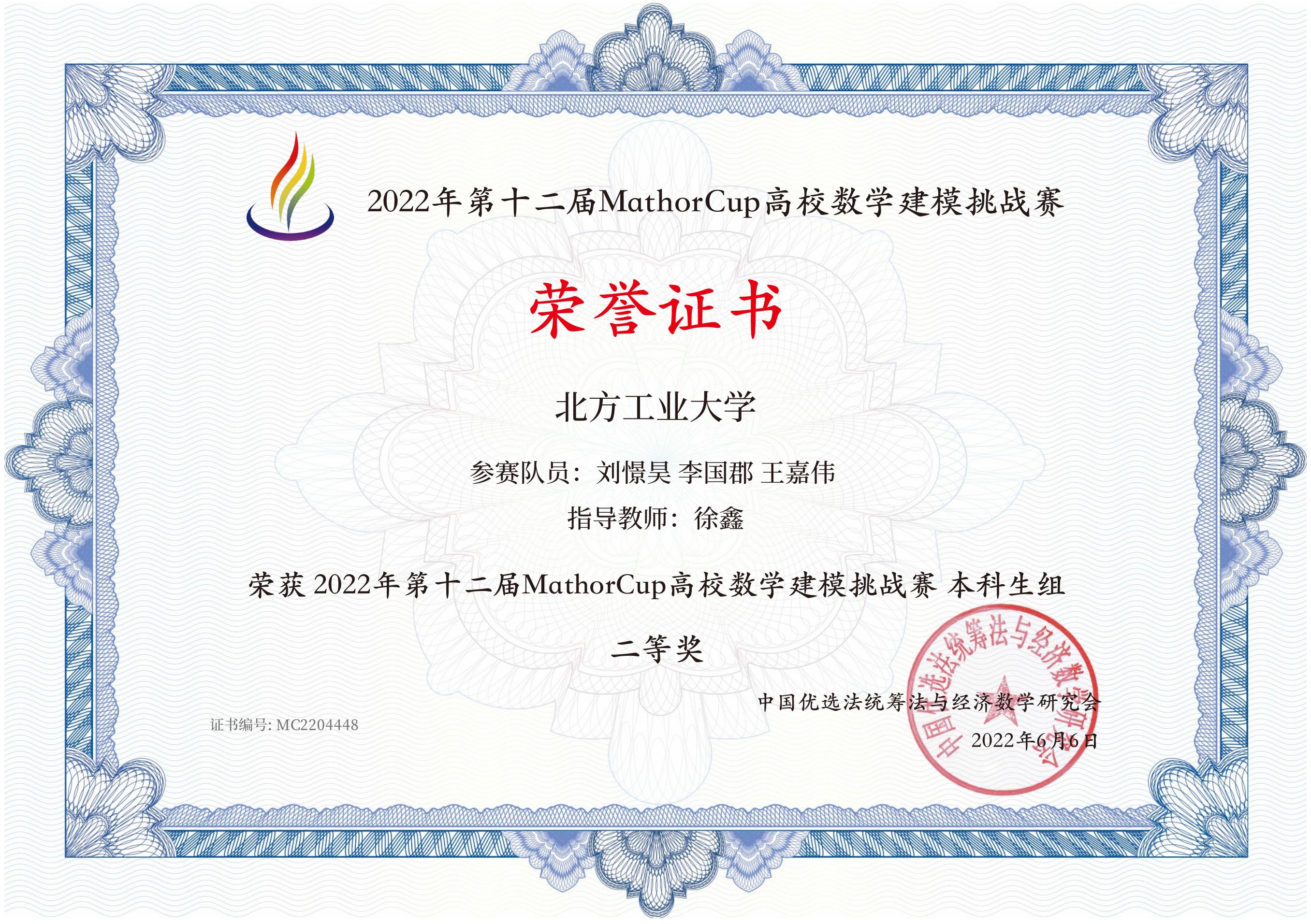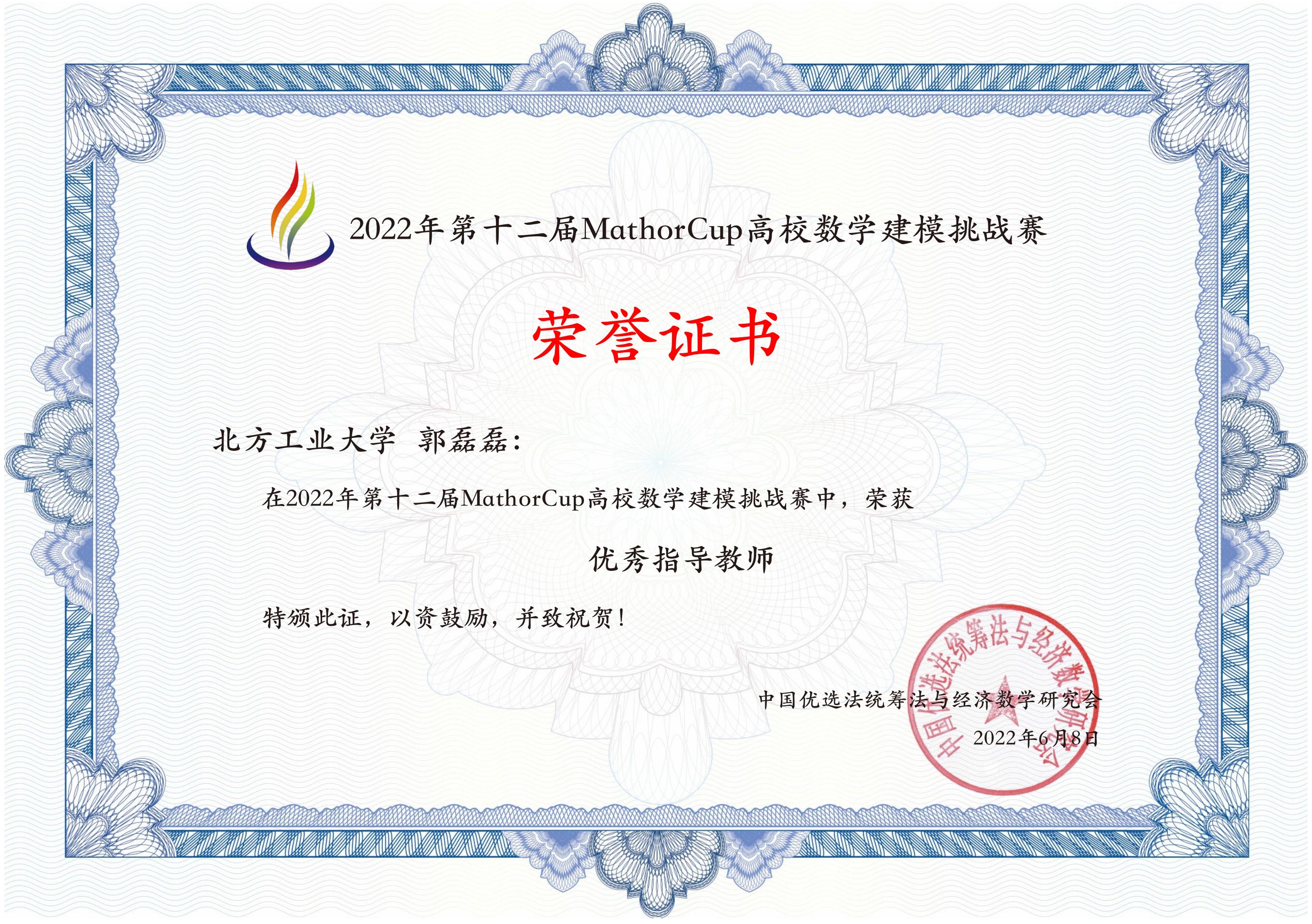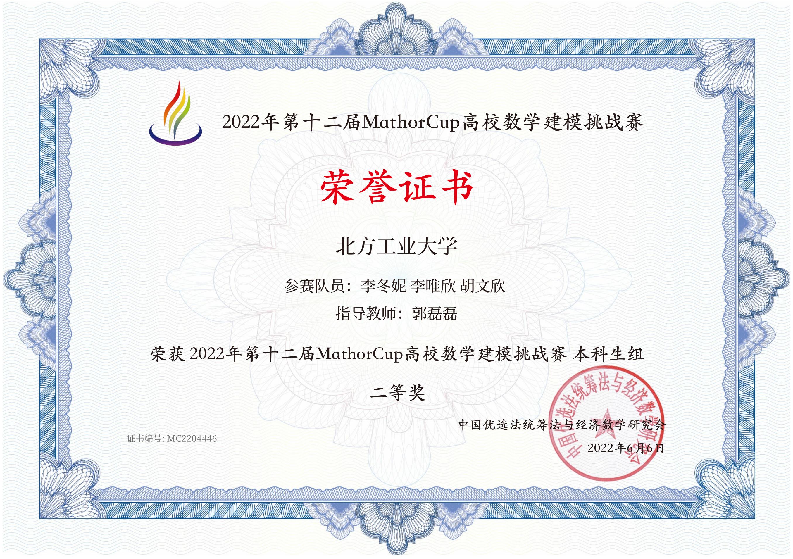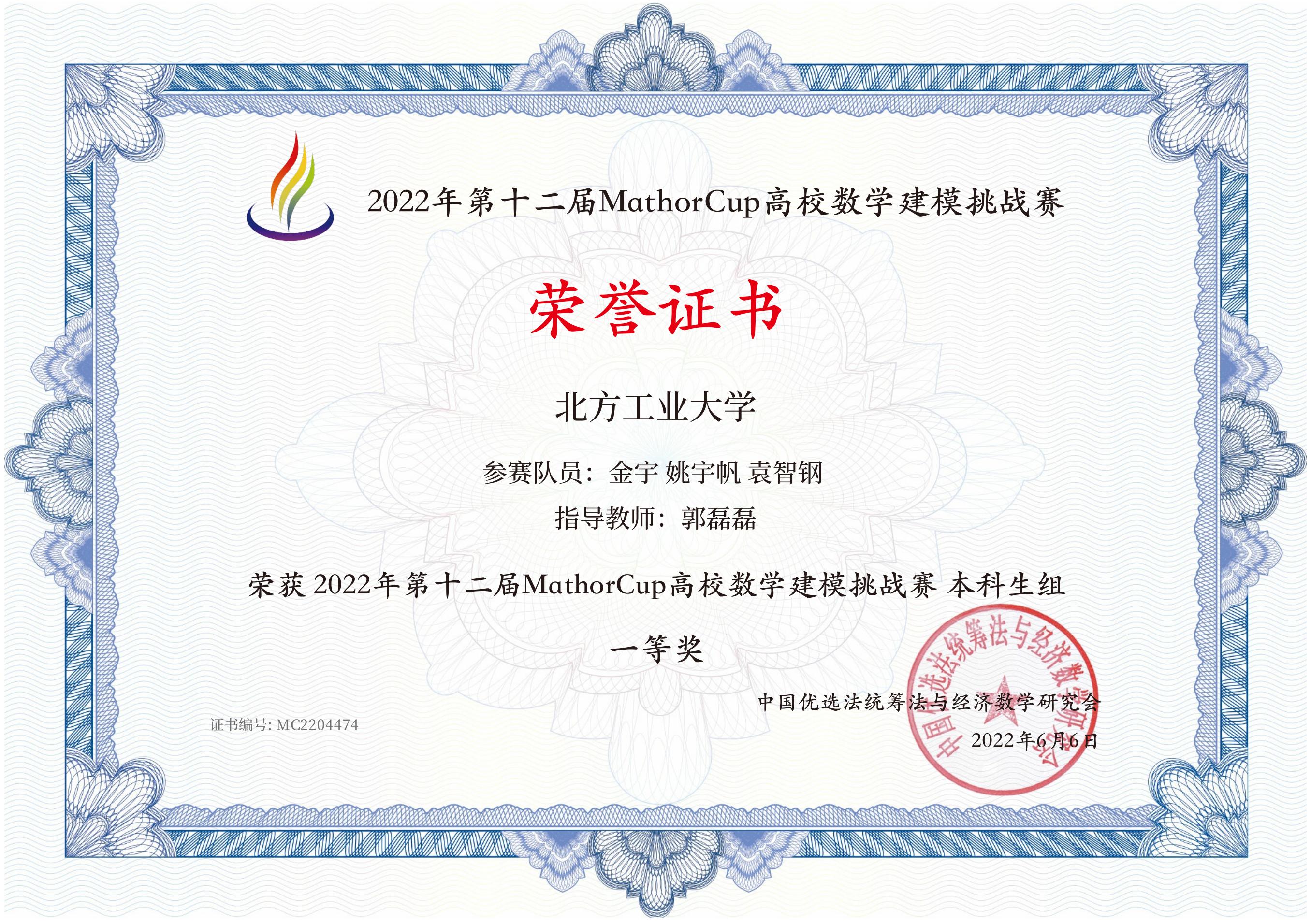 近日,2022年第十二届MathorCup高校数学建模挑战赛成绩揭晓。买球官网24个代表队参赛,共获得一等奖1项(3人),二等奖3项(9人),三等奖8项(24人)。买球官网被评为“优秀组织单位”,指导教师郭磊磊被评为“优秀指导教师”。