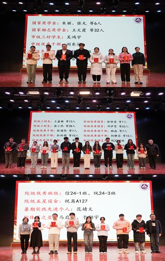 表彰环节中,杨嵩松为获得国家奖学金、国家励志奖学金、市级三好学生、市级优秀学生干部、市级先进班集体、学校五四青年奖章、重大竞赛获奖代表、暑期社会实践先进个人、首都高校“活力团支部”的学生代表颁奖。李冱岸为获得校院两级三好学生、优秀学生干部、校级优秀研究生干部、校级优秀研究生、校级优秀班级体、优秀团员、优秀团干部、优秀团支部的学生代表颁奖;贺映勇和李红梅为获得院级优秀班集体、五星宿舍、体育之星、学习之星的学生代表颁奖。