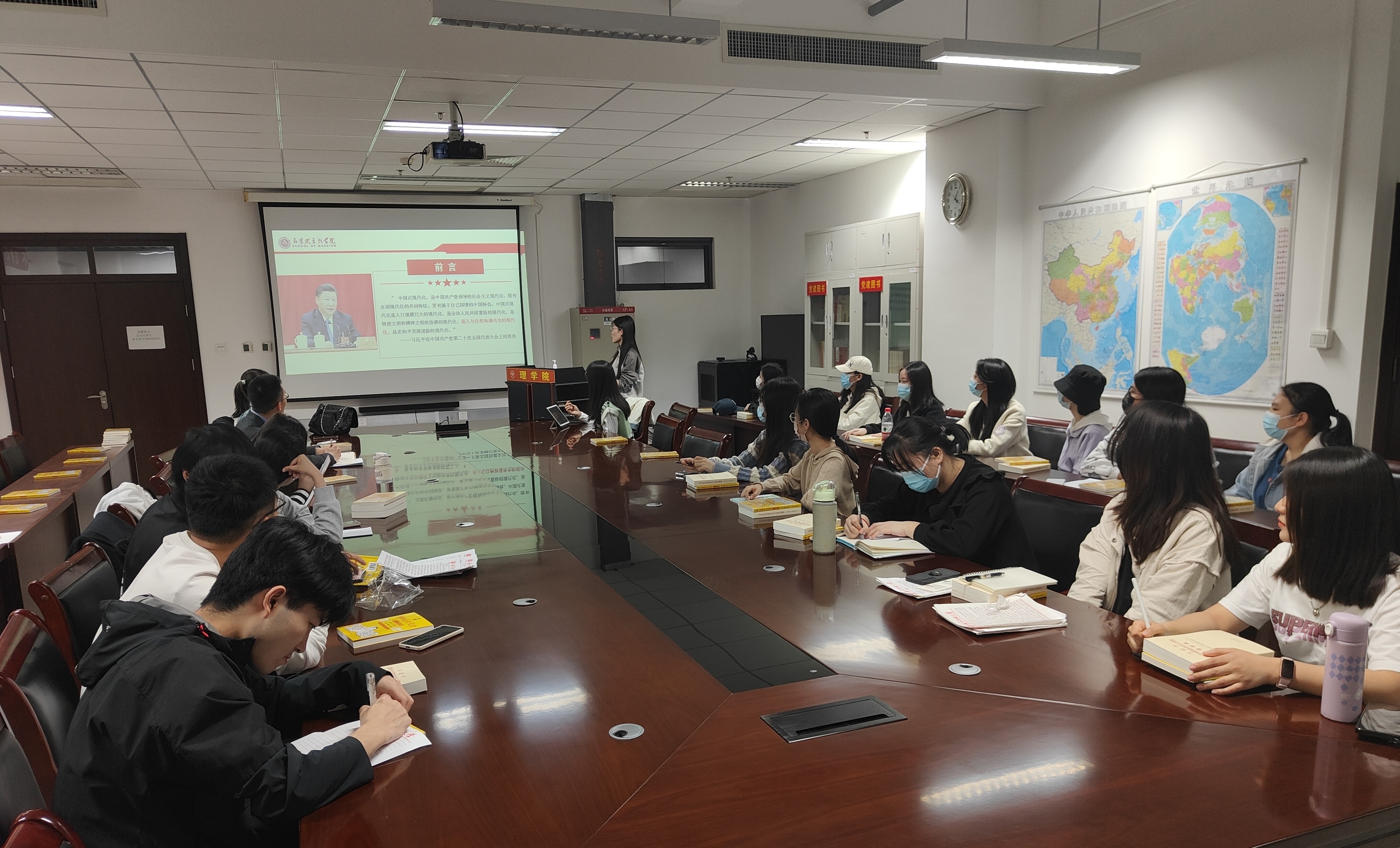 为深入学习领会党的二十大精神,深刻把握中国式现代化的基本特征。4月20日下午在博远楼805,买球官网数学系本科生党支部邀请马克思主义学院学生宣讲团成员开展专题宣讲活动,宣讲团成员是来自马克思主义学院的任书明、邓墨、梁芷洁三位同学,参加本次活动的有数学本科党支部全体党员和部分积极分子代表。