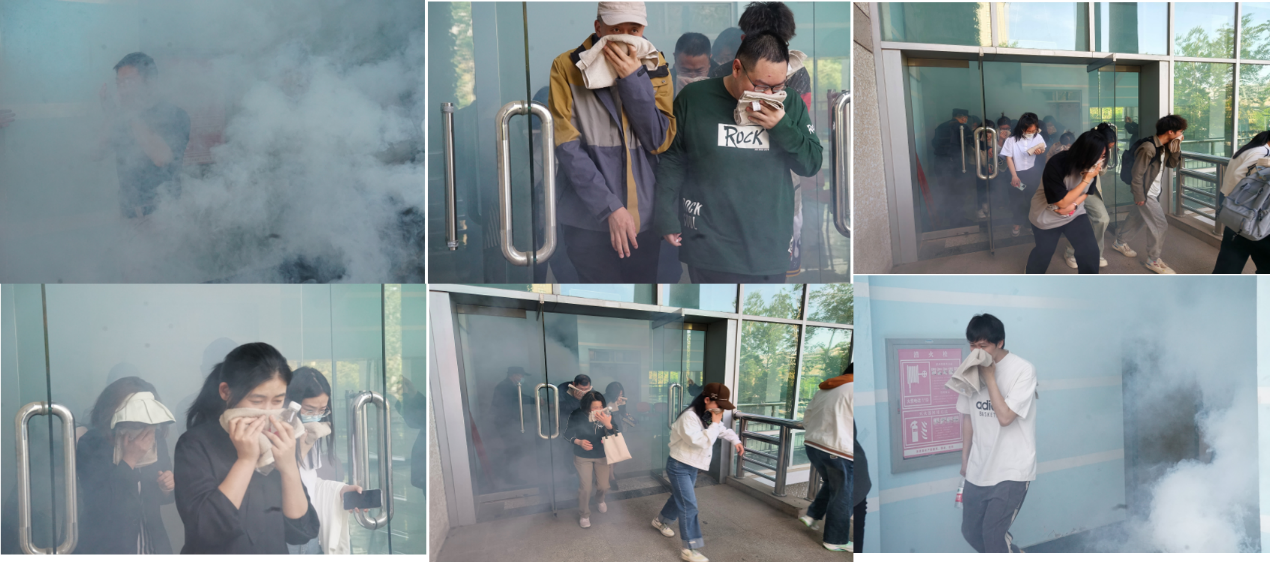 在消防演练单元,随着模拟火情警报声响起,师生根据设定的疏散路线,用毛巾捂住口鼻,弯腰低姿的方式进行疏散,迅速从体育馆二层撤离到了户外广场。疏散过程快速、有序,全体师生配合默契,达到了预期效果。